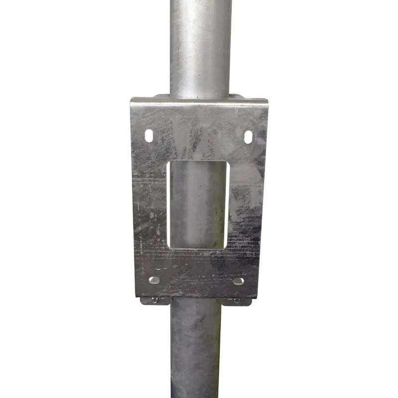 Zur Befestigung der Tränken mit deren Metallschutzrahmen an den runden Ø 76 oder 102 mm Pfosten, mittels 2 inbegriffen 1/2-Schellen, die Winkelverstärkungen und Bohrungen besitzen.